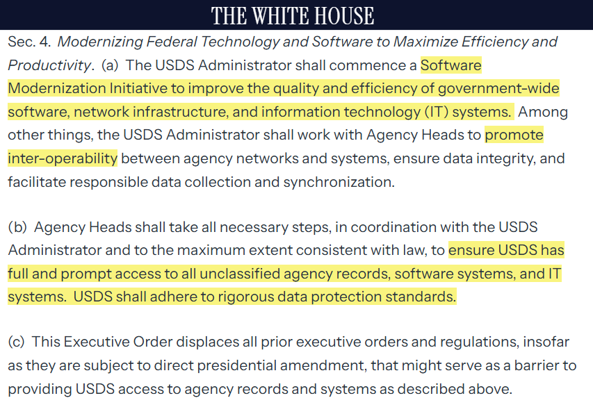 The DOGE executive order reads as though they’re setting up a “business transformation enabled by technology.” The US Digital Services (USDS) was established by Obama to streamline government technology programs after the “Obamacare Website” disaster. Trump’s executive order renames the USDS and establishes a temporary program office that reports to White House Chief of Staff Susie Wiles.