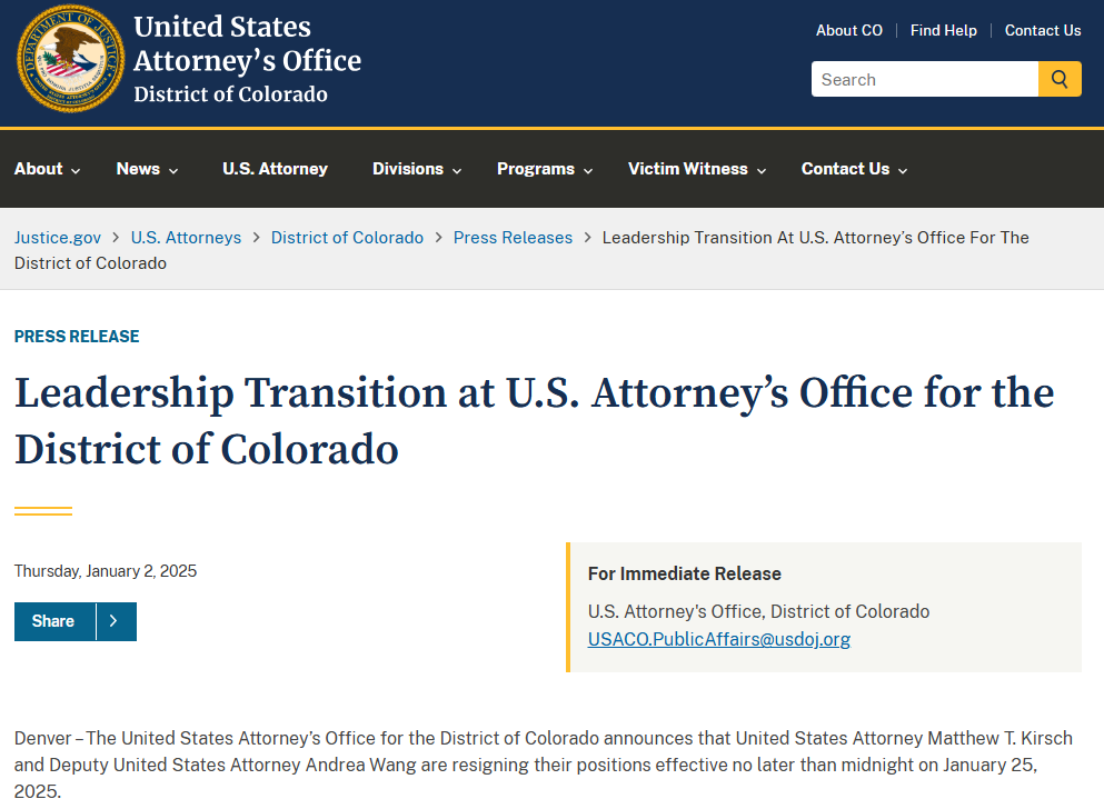 The Colorado US Attorney may not have been named yet, but his or her predecessor, the Biden-era attorney for Colorado as well as his deputy, resigned following the 2024 election.