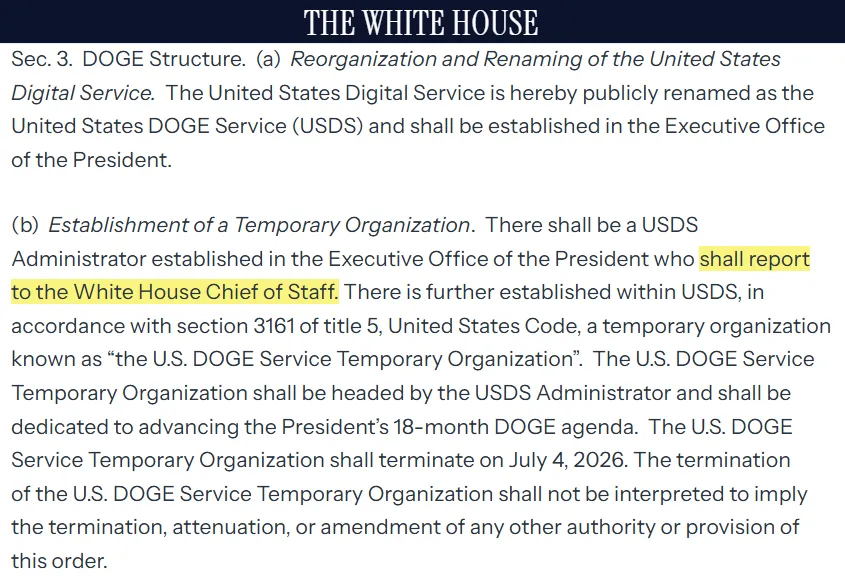 “There shall be a [United States DOGE Services] USDS Administrator established in the Executive Office of the President who shall report to the White House Chief of Staff.”