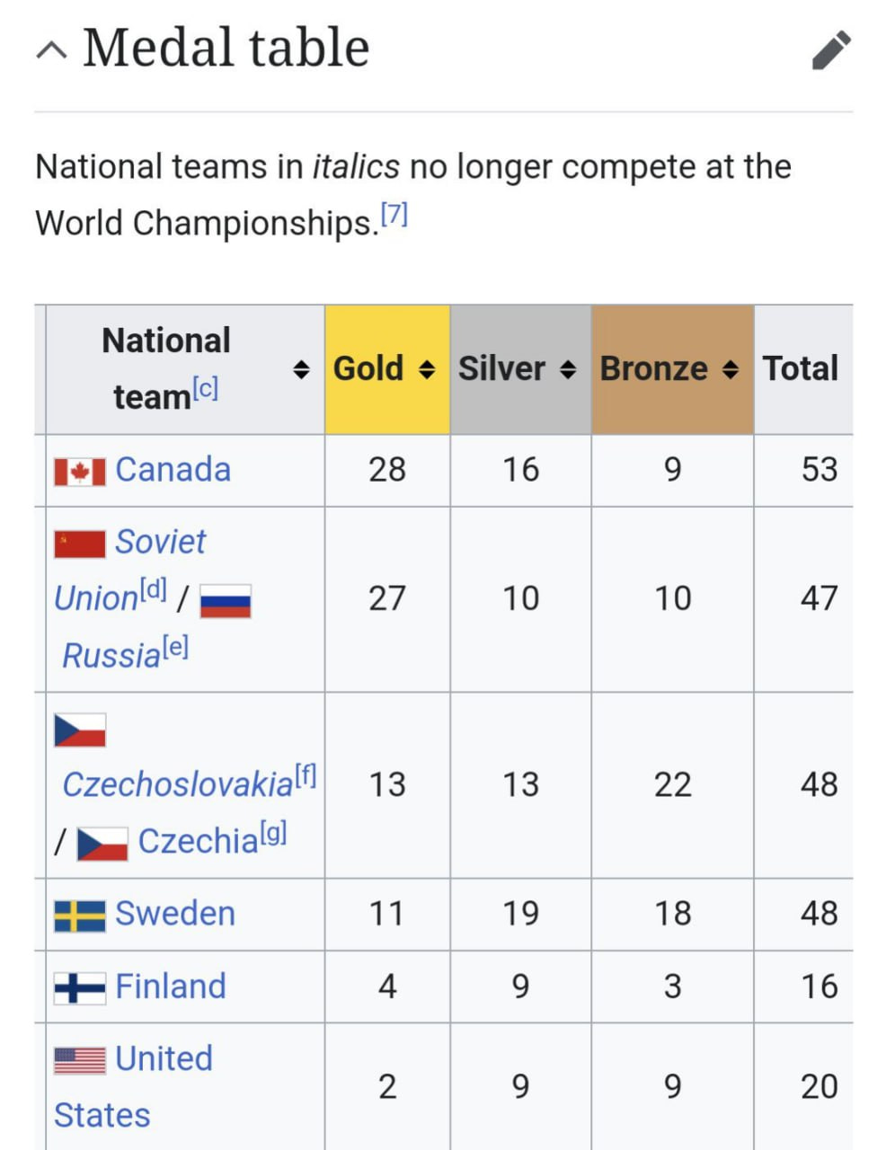 The US played Canada on Saturday night in Montreal. While the United States dominates most sports at every Olympics, hockey is the unique exception. For context, here is the medal breakdown from various world championship events: