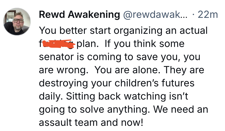 … is going to enact the Fourth Reich and enact firing squads. I also found a few mostly peaceful leftists who were making death threats: