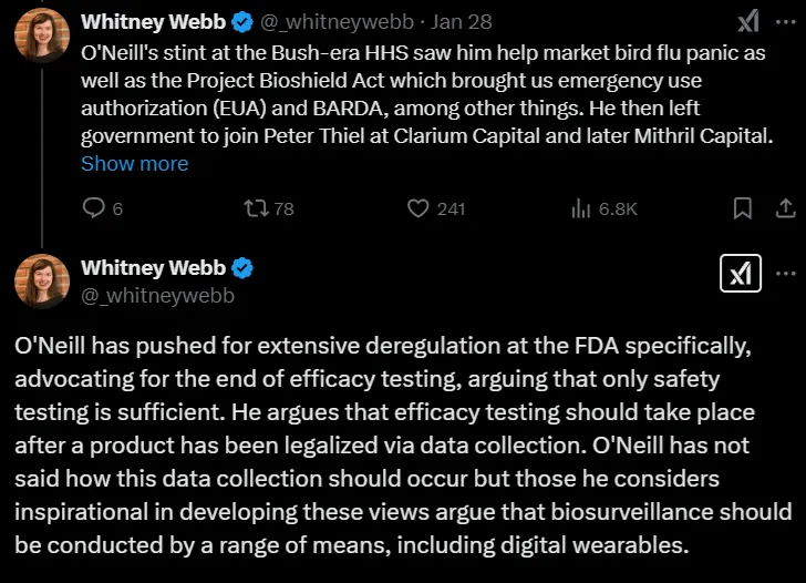 Kennedy built his platform on skepticism of mainstream medicine, vaccine safety reviews, and rooting out corporate influence in agencies like the FDA and CDC. His “MAHA” vision emphasizes transparency, chronic disease prevention, and challenging Big Pharma. O’Neill, however, comes from a Silicon Valley biotech world, with deep ties to Peter Thiel (Bilderberg Steering Committee, Israel/CIA ties, alleged Epstein associate, Opus Dei connections) and a track record of pushing experimental technologies like regenerative medicine and anti-aging therapies. Counter to what RFK has proposed, O’Neill has previously advocated for lighter FDA regulation—approving drugs based on safety alone, not efficacy—which could clash with Kennedy’s focus on rigorous science and public trust.