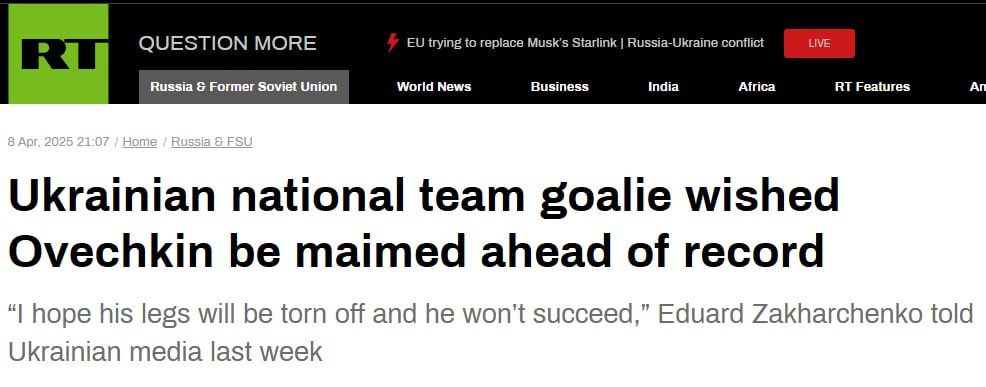 And to add another wrinkle to the geopolitical angle of this story: After Ovechkin tied Gretzky’s record on Saturday, and was expected to break in a game the next day, the goalie for the Ukrainian national team came out and said, “I hope his legs will be torn off and he won’t succeed.”