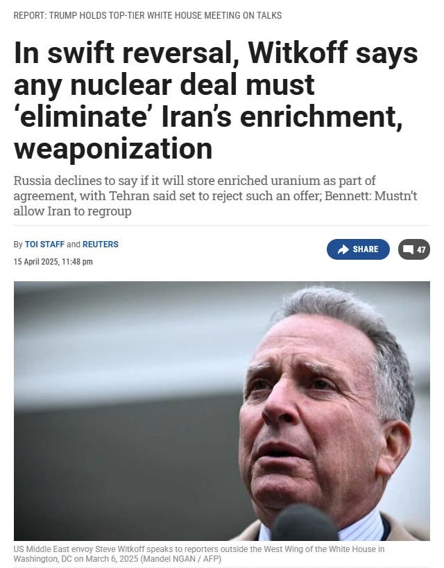According to a number of reports going back several weeks, various figures within the administration are salty toward Witkoff: Secretary of State Marco Rubio is bitter because President Trump has brought in a Special Envoy to do his job (Colonel Lawrence Wilkerson says that Colin Powell told George Bush that he would only agree to be Sec of State if Bush promised to never appoint any Special Envoys); General Keith Kellogg is said to be upset that Witkoff has been brought in to replace him in the negotiations with Russia; National Security Advisor Mike Waltz is reportedly outraged that Witkoff has set up several face-to-face meetings with President Putin; and US Ambassador to Israel Mike Huckabee has said that he feels the same way due to Witkoff’s cavalier attitude about meeting with Hamas.