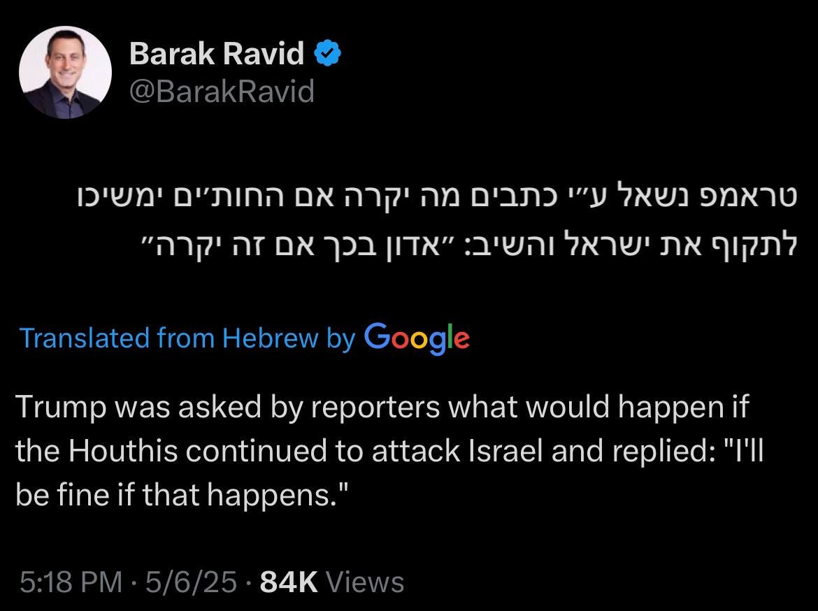 Israeli journalist Barak Ravid seemed to have a similar read on the situation, reporting on his X account that Trump didn’t seem fazed by the idea that Israel and the Houthis may continue to fight one another.