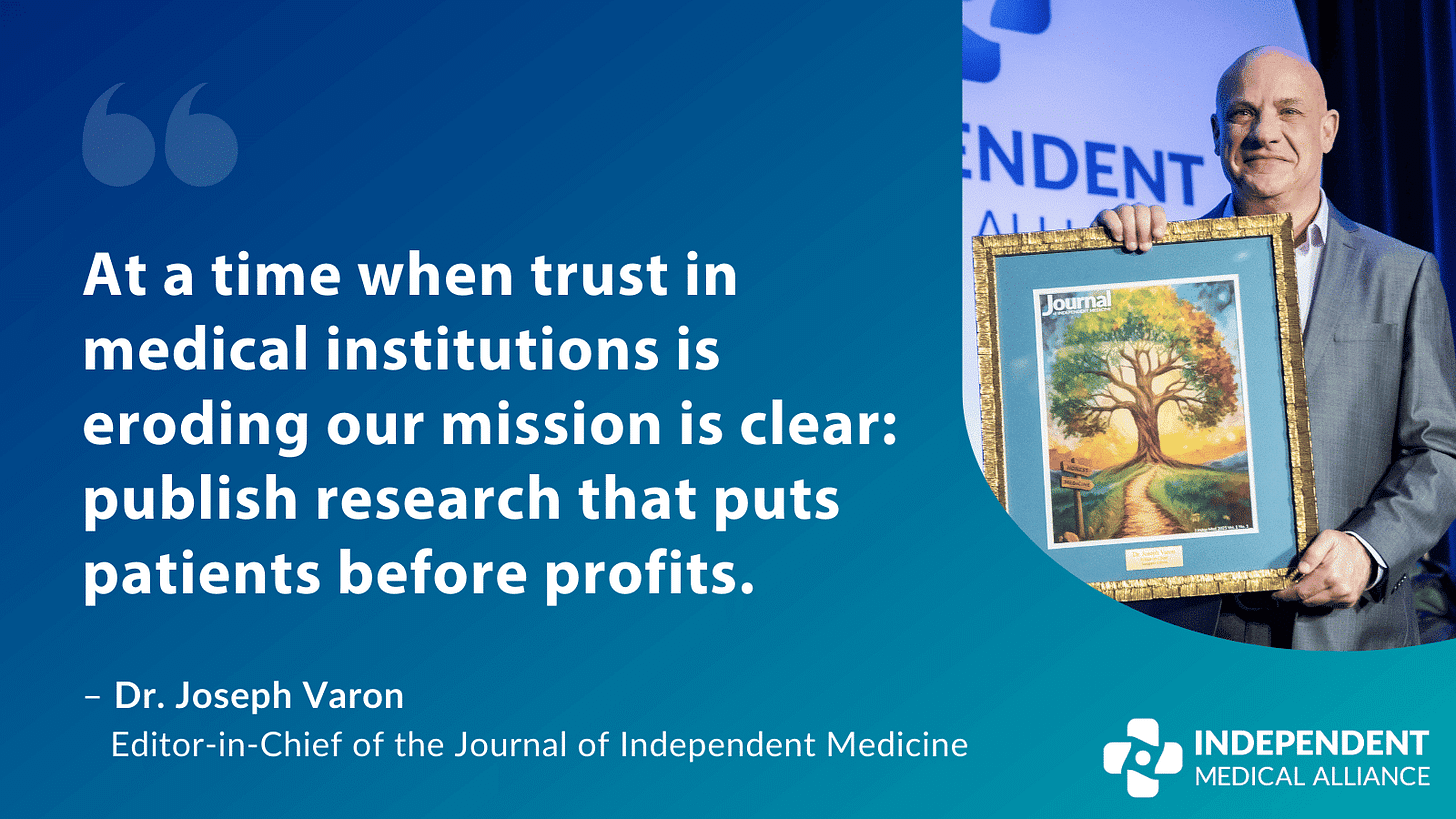 The Journal of Independent Medicine, published by the Independent Medical Alliance™ (IMA), is a quarterly peer-reviewed, multi-specialty journal dedicated to advancing unbiased medical research. The IMA is a nonprofit, 501(c)(3) organization and coalition of physicians, scientists, and other healthcare professionals united by a mission to restore trust and transparency in healthcare.