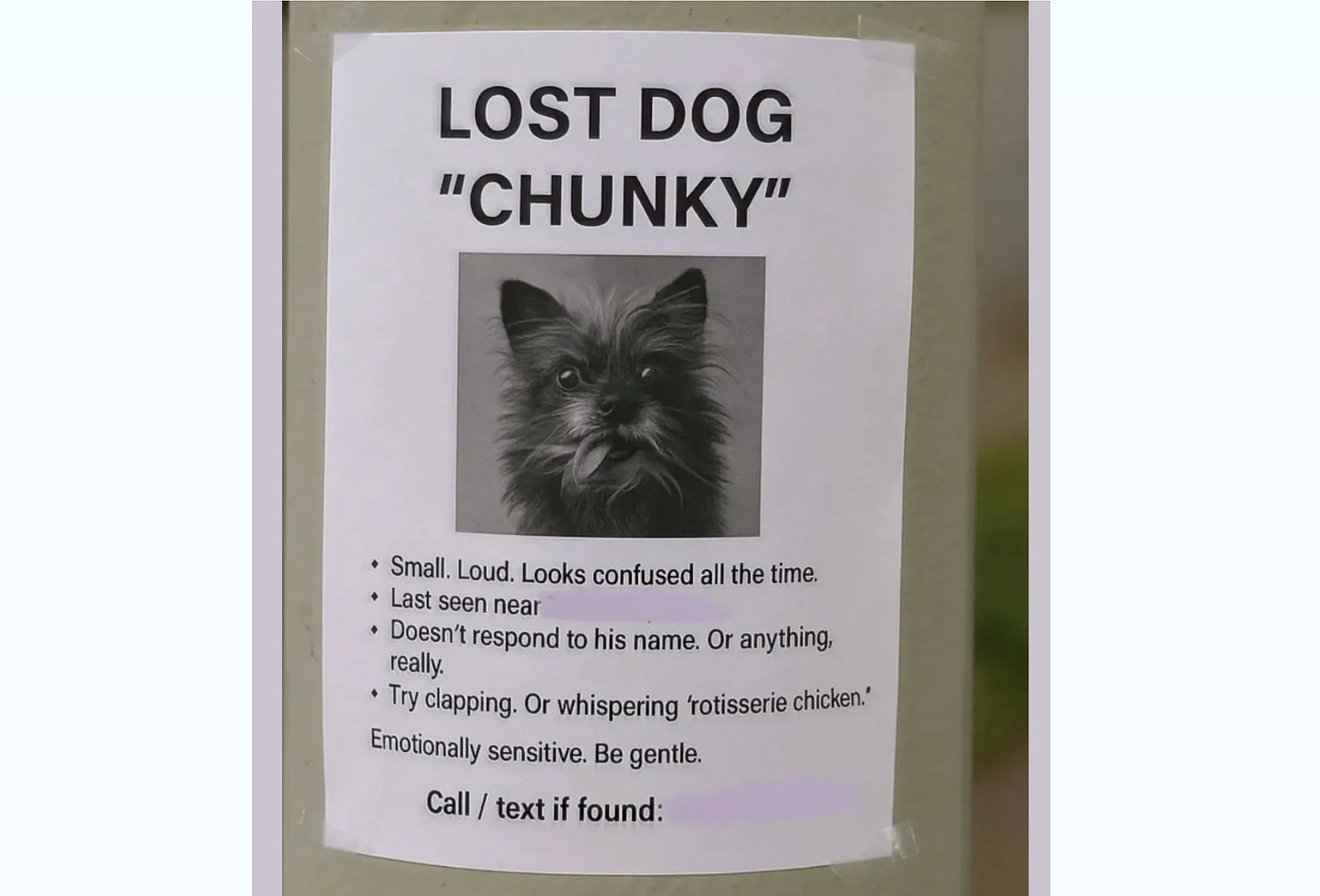 Yeah. That happened. Last week, I was walking back from the store and saw one of those “Lost Cat” flyers taped to a pole. It had a blurry photo and dramatic phrases like “please help us find Mr. Whiskers” which for some reason made me laugh more than it should have. Maybe it was the Comic Sans. Maybe it was the fact that the cat looked like it hated everyone, including the person who made the flyer. Either way, I got the dumb idea to make one myself. But with a fake dog.