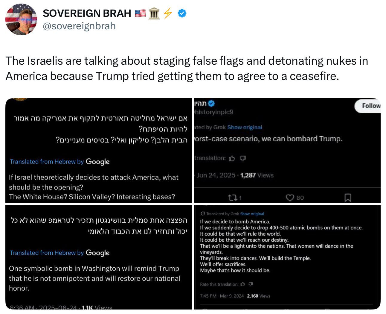 “Israelis are threatening false flags on America, potentially nuclear. Yep, the ones who will drop the nuclear bomb is Israel… Any of you heard about The “Samson” Option? Now they’re openly plotting raising the 3rd Temple. They are forging prophecies from Revelation and attempting to bring on the End Times: