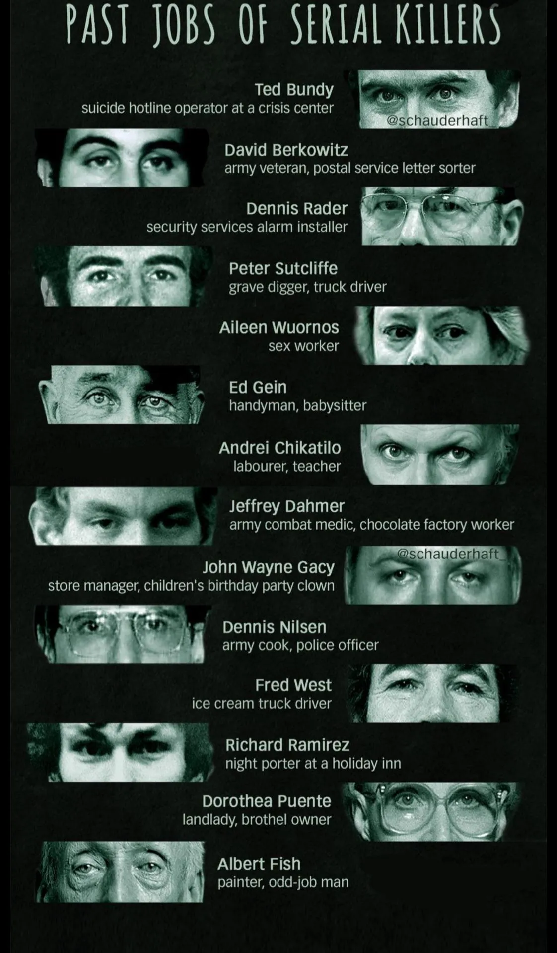 “Some may be inaccurate (i.e. Gacy was a building contractor, the clown thing was a side gig)… Anyhow, interesting…
