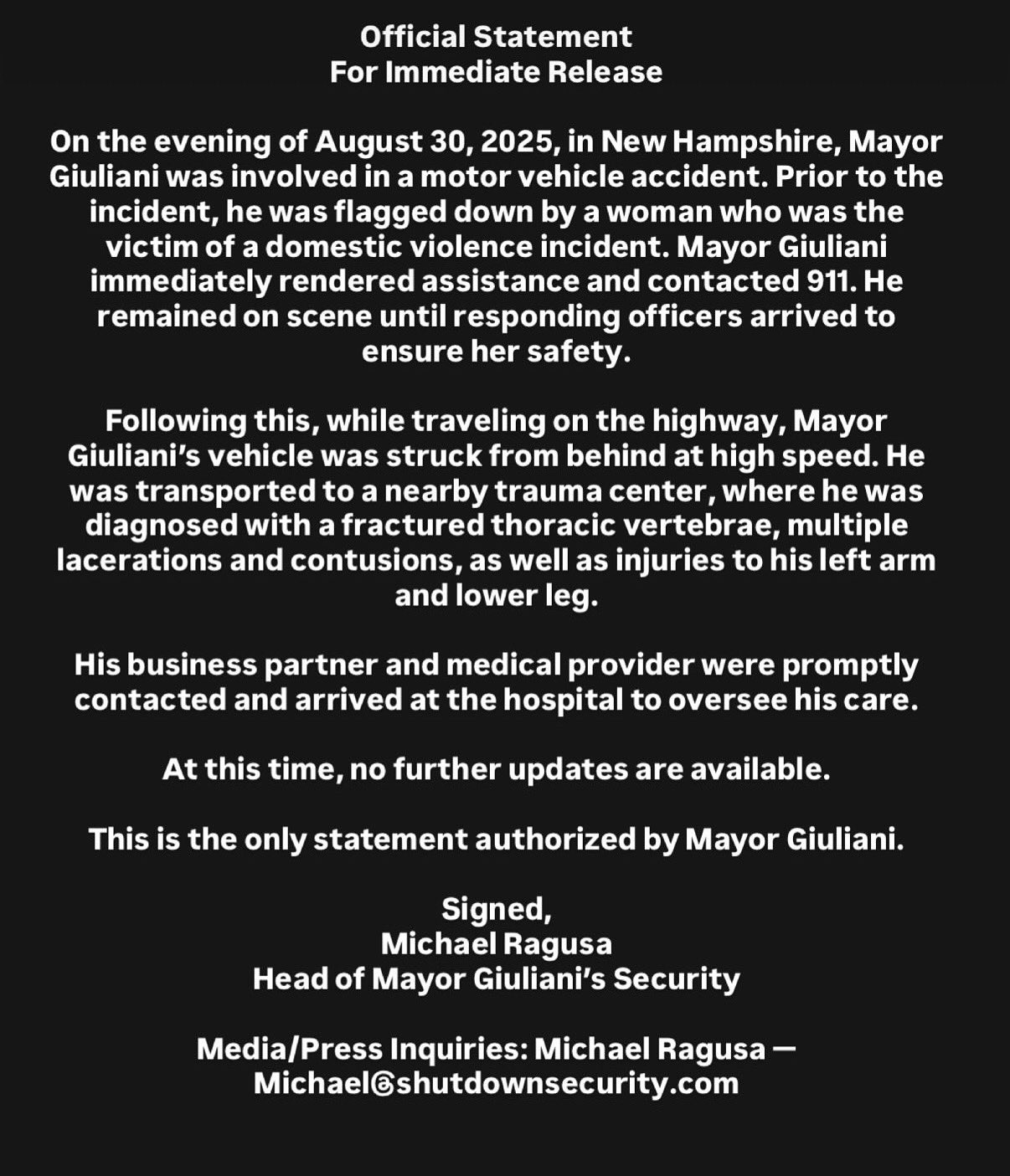 The former mayor is “in good spirits and recovering tremendously,” according to his head of security, Michael Ragusa.