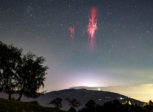 “Lightning bolts shoot upward from storm clouds into space—rare red “sprites” photographed in Italy. Nature’s fireworks show scientists refused to believe until 1989…”