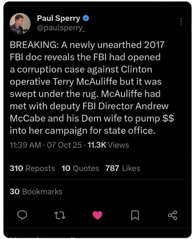 The document, which was provided to Grassley by a whistleblower, includes a case update drafted by then-Supervisory Special Agent Tim Thibault about the Washington Field Office’s public corruption investigation into Virginia Democrat Gov. Terry McAuliffe linking former President Clinton to the case.