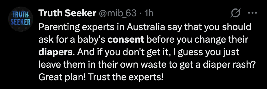 Yes, leave it to the Aussies to educate the rest of humanity on the finer points of infant consent. I don’t know if we should be taking cues — no matter how educated and researched — from a country that calls diapers “nappies.” But anyway…