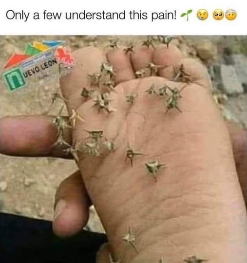 1. Sand burrs – and those suckers hurt bigly!!!! They are also impossible to completely eradicate, altho I’ve got them under control in my driveway at the moment. Still, they come back, unless you dig into the dirt and get your fingers around the base plant and pull it out by the roots. They have one barb that is very hard and longer than the others. Similar to this but w/longer spines: