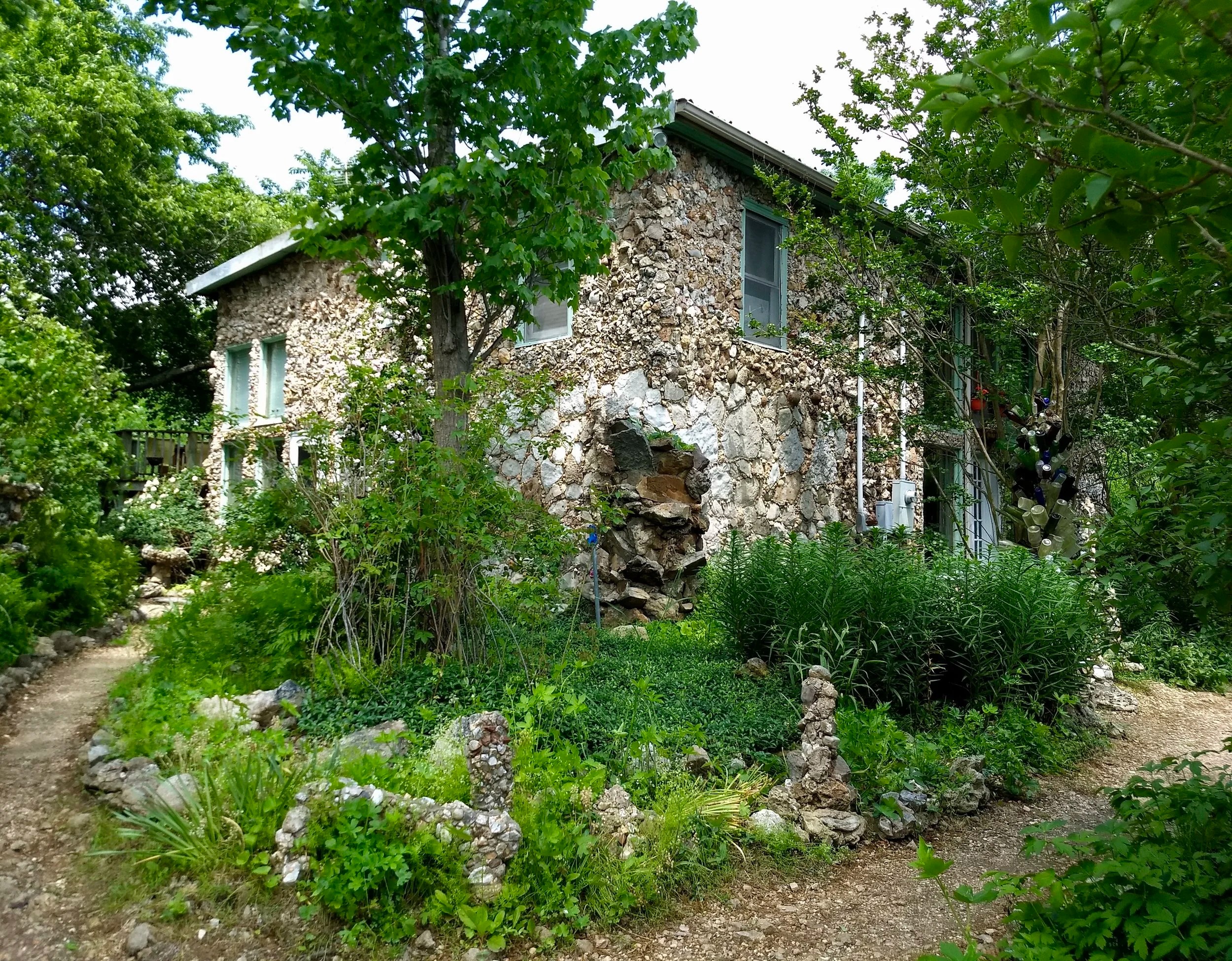 Stones that Mrs. Quigley began collecting as a girl assumed an important part of the house. Working tenderly for three years, Mrs. Quigley covered the outside walls with a collection of fossils, crystals, arrowheads and stones selected from the creek beds for their beauty. A perennial garden surrounds the house.