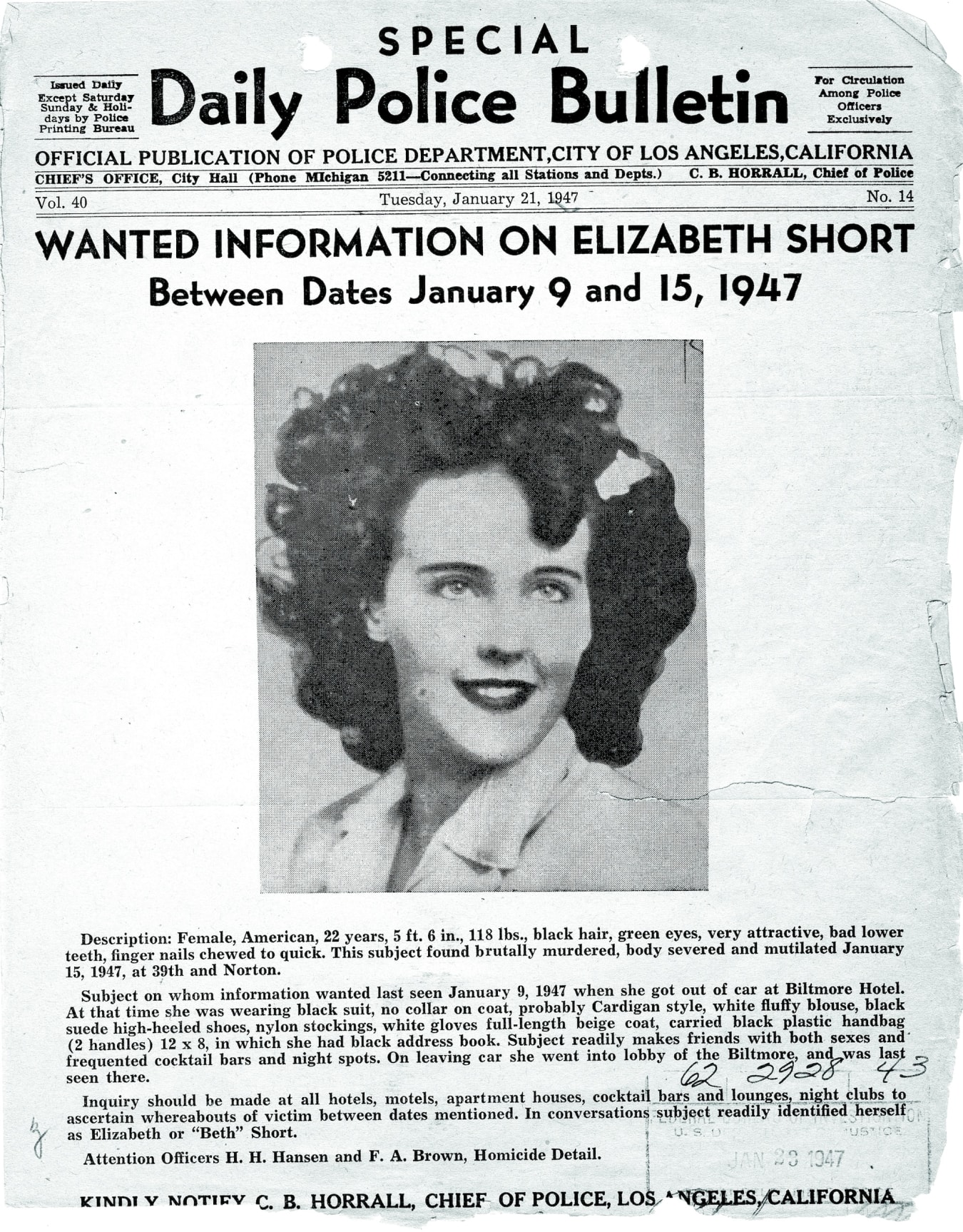Short’s body was discovered on January 15, 1947, in a vacant lot in Los Angeles. The brutality that had been visited upon her, both pre- and post-mortem, is still shocking: Her face had been grotesquely disfigured, her body cut in half, and some of her organs removed, among other acts of torture and mutilation. No one was ever arrested for Short’s murder, and the case eventually went cold. Recent theories have blamed everyone from Orson Welles to Bugsy Siegel.